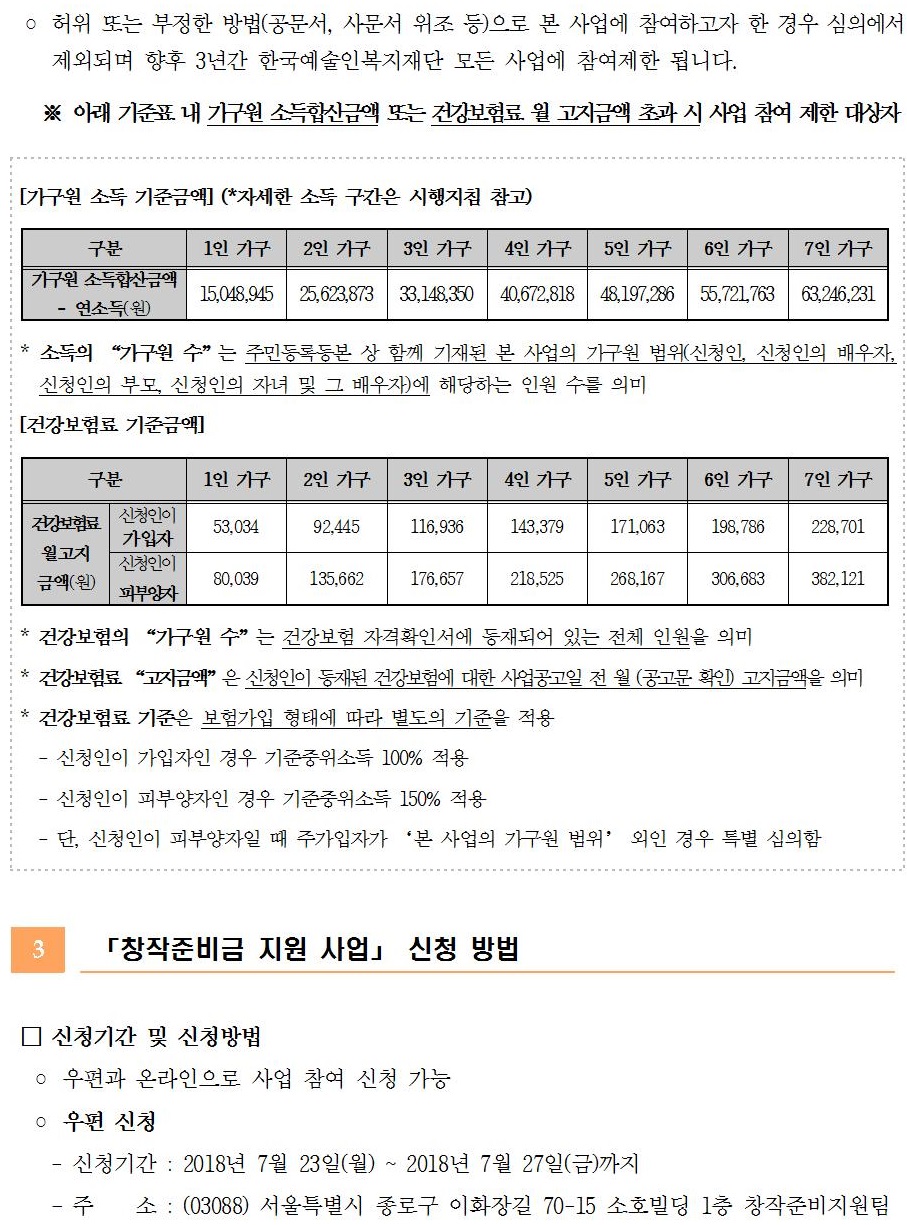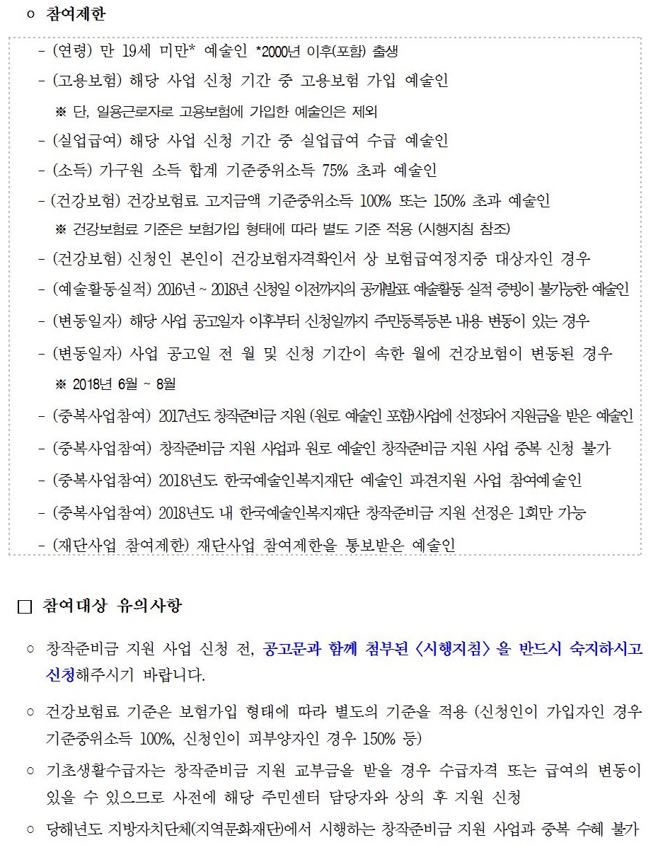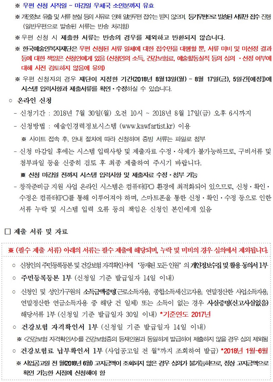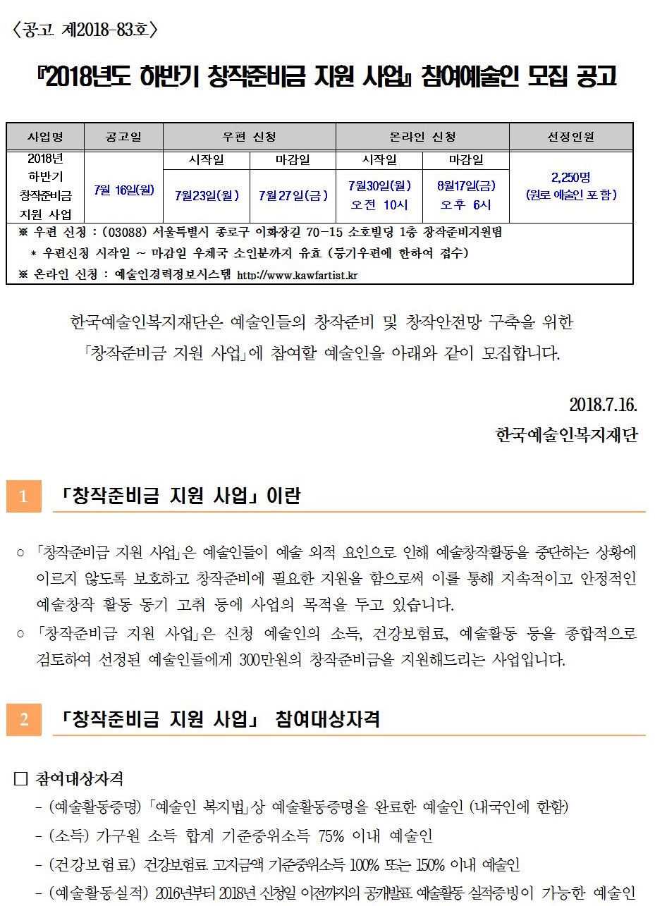 | 제목 | 『2018년도 하반기 창작준비금 지원 사업』참여예술인 모집 공고 | ||