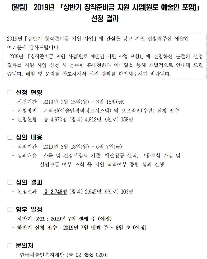 〔알림〕 2019년 「상반기 창작준비금 지원 사업(원로 예술인 포함)」선정 결과