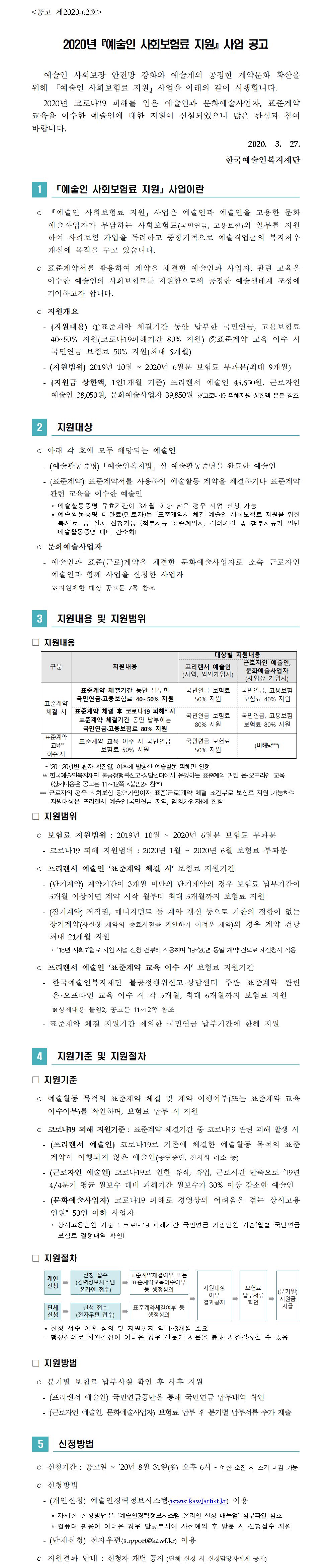 | 제목 | [공고] 2020년 『예술인 사회보험료 지원』 사업 공고 | ||