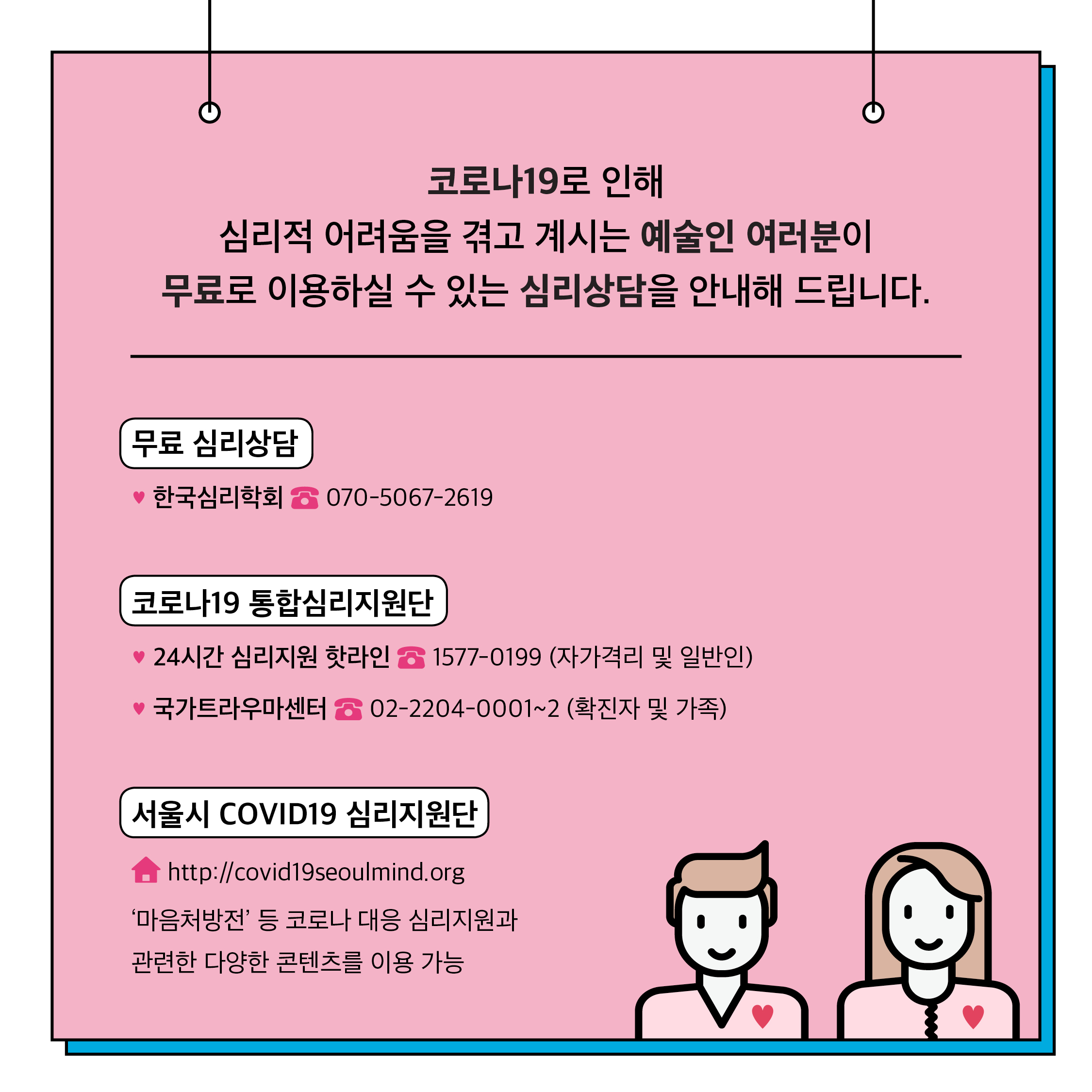 한국예술인복지재단은 예술인분들의 심리적, 정신적 어려움을 나누고 이를 함께 극복하기 위해 예술인심리상담지원사업을 시행하고 있습니다. 다만, 올 해 예술인심리상담지원사업 중 개인 심리상담 프로그램을 신청해 주신 분들이 많아 부득이하게 개인 심리상담 신청을 계속해서 받지 못하게 되었음을 알려드립니다. 예술인심리상담지원사업에 관심과 애정을 가져주시고 적극적으로 참여해 주신 예술인 여러분께 감사드립니다. 개인심리상담 신청을 종료되었지만 코로나19로 인해 어려움을 겪고 계신 예술인분들을 위한 무료 전화상담을 계속해서 운영하고 있습니다. 마음을 나누고 싶으신 예술인분들의 전화를 기다리고 있겠습니다. ![]() [문의] 권리보장팀 심리상담 담당 02-3668-0264 |