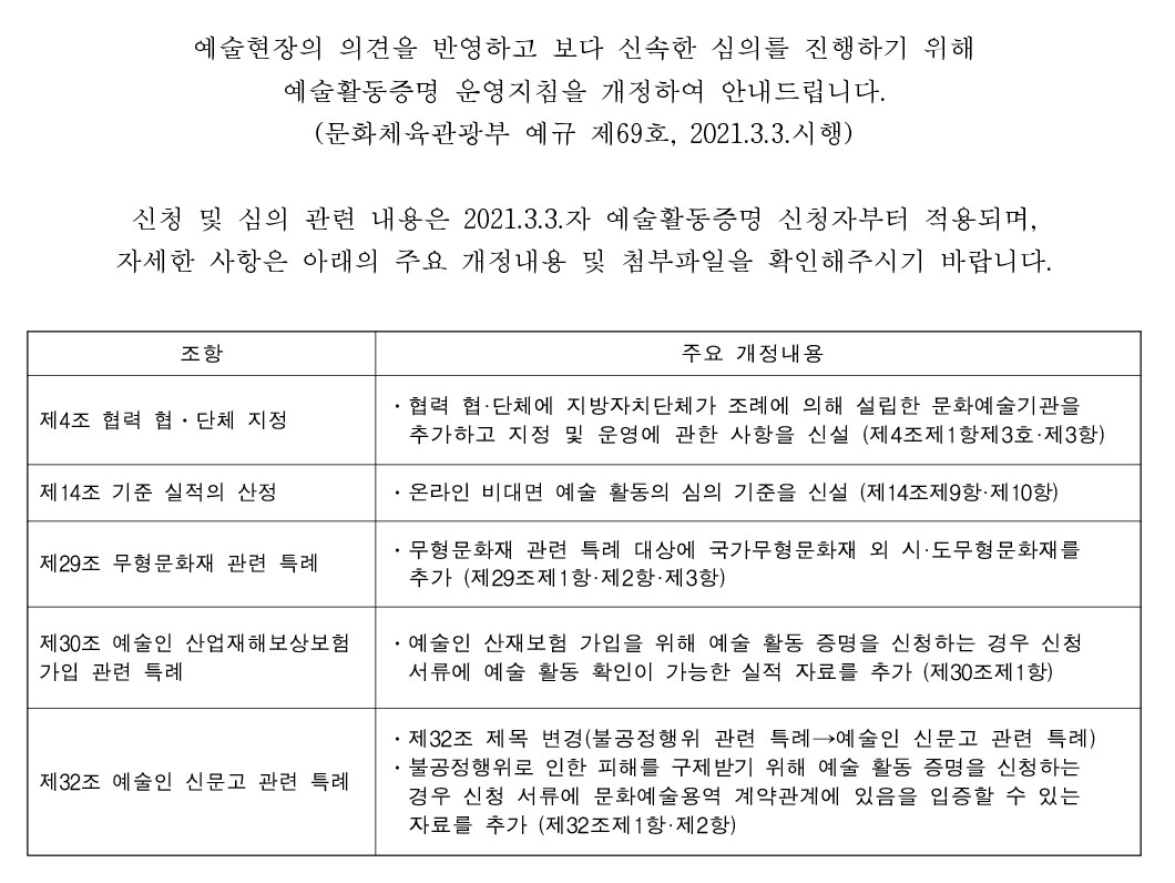 | 제목 | [안내] 예술활동증명 운영지침 개정 안내(2021.3.3.시행) | ||
