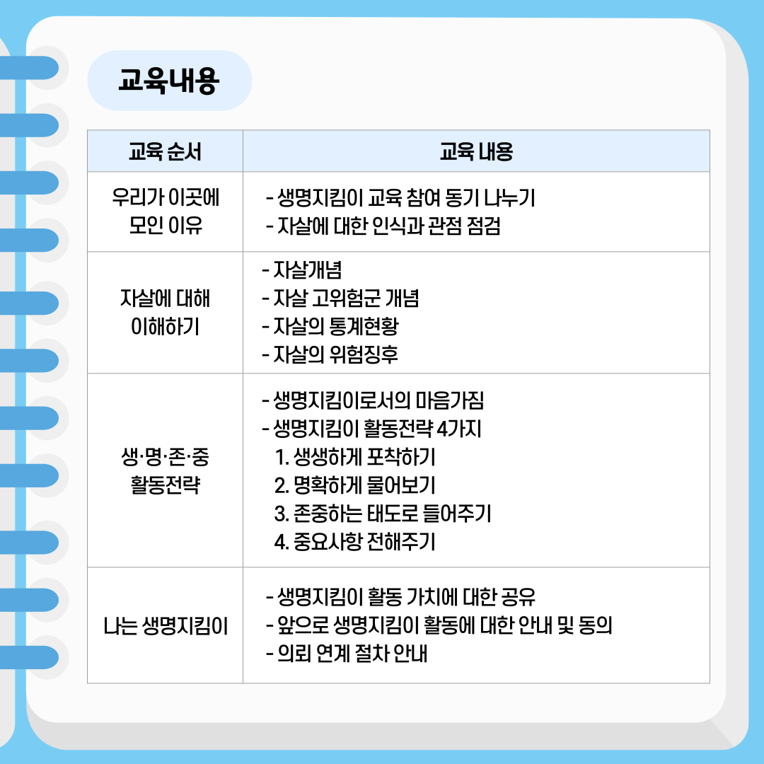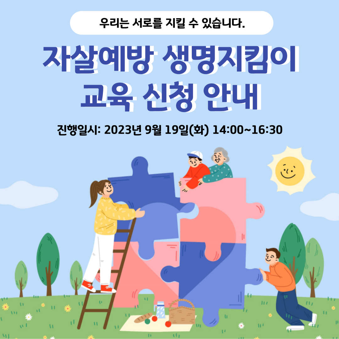 | 제목 | 2023년 제2차 자살예방 생명지킴이 교육 참여 신청 안내 | ||||||||||||
