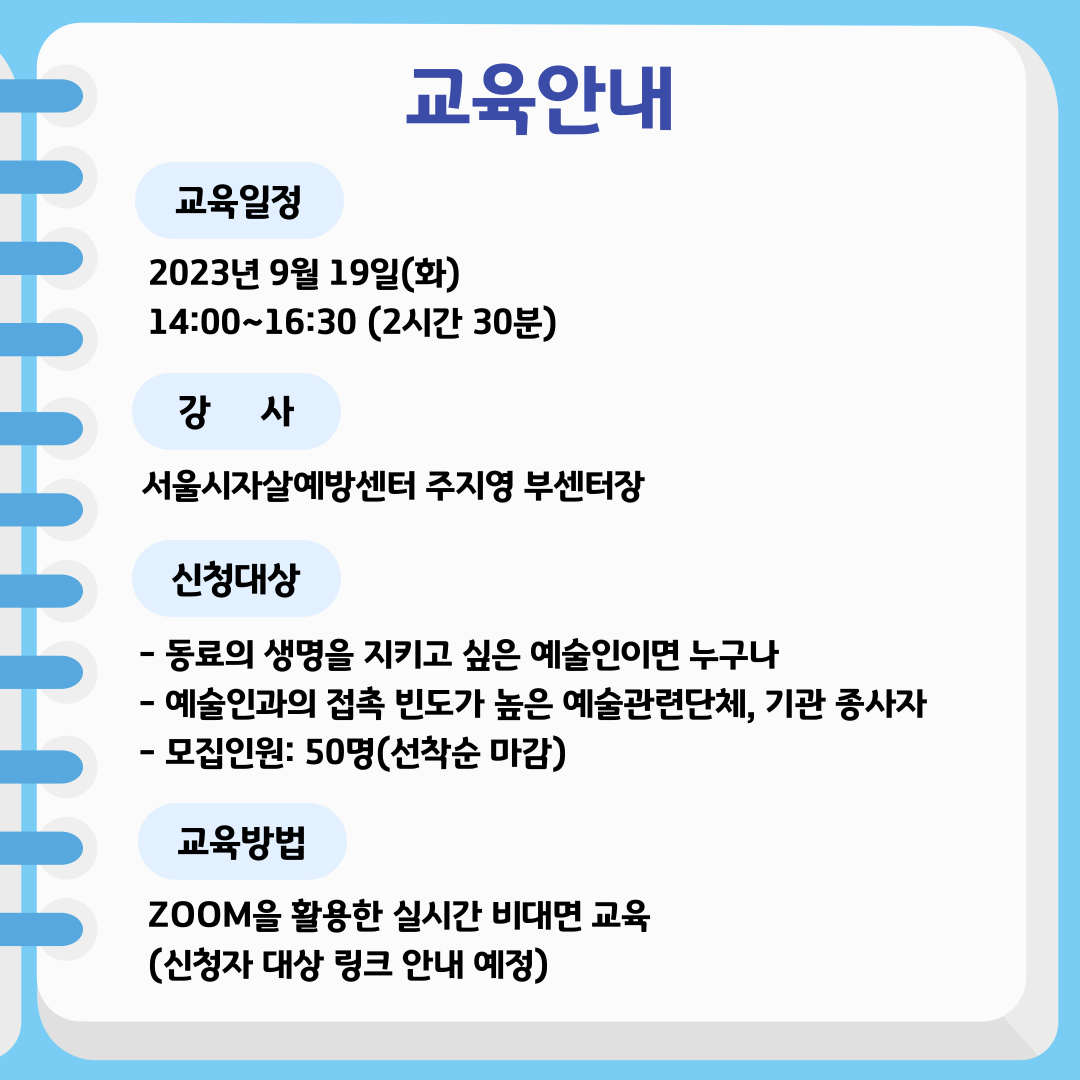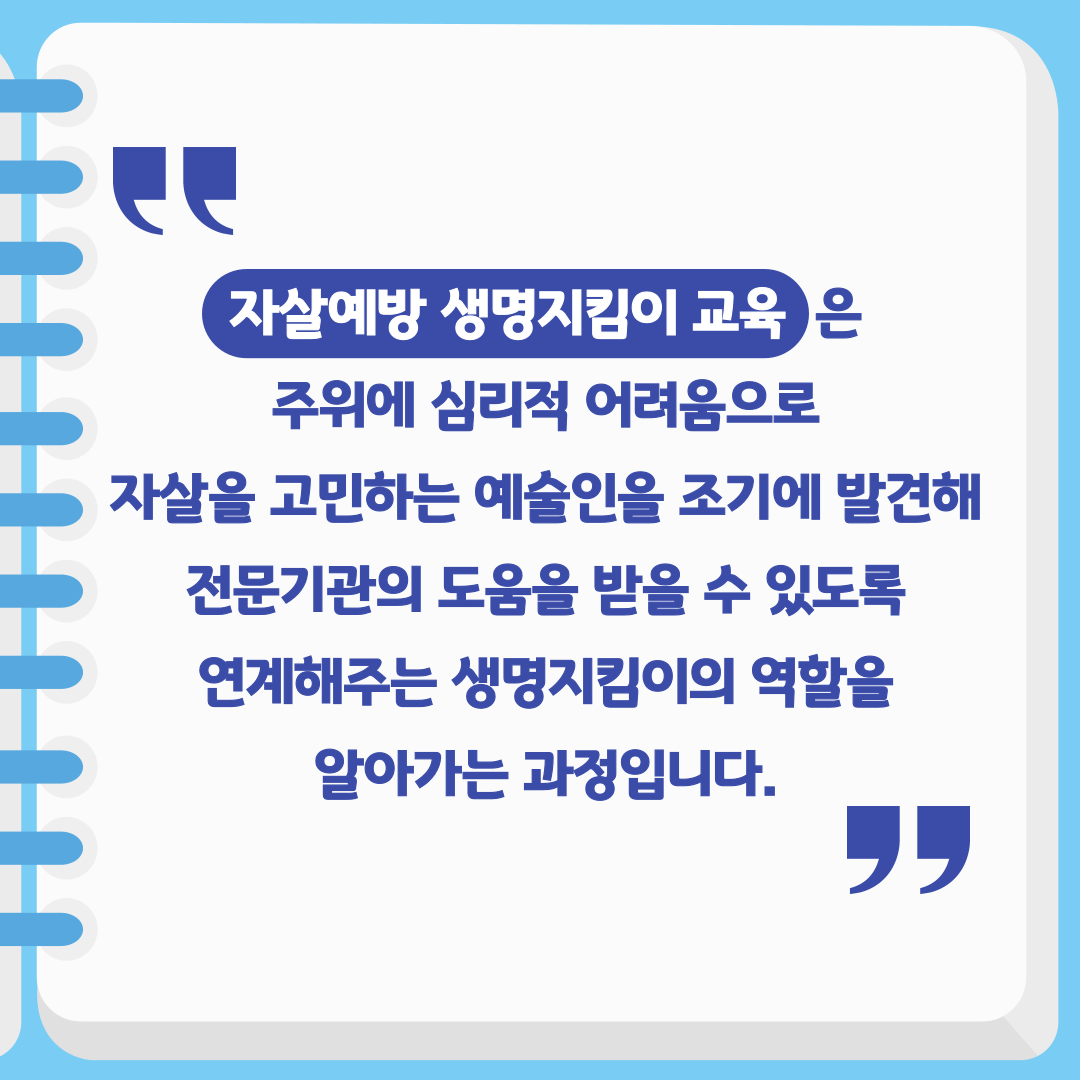 ![]() ![]() ![]() ![]() 2023년 제 2차 자살예방 생명지킴이 교육 참여 신청 안내 본 교육은 주위에 심리적어려움으로 자살을 고민하는 예술인을 발견하고, 도움을 제공하여 전문 서비스로 연결해 주는 생명지킴이의 역할을 알아가는 과정입니다. 1. 교육명: 자살예방 생명지킴이 교육