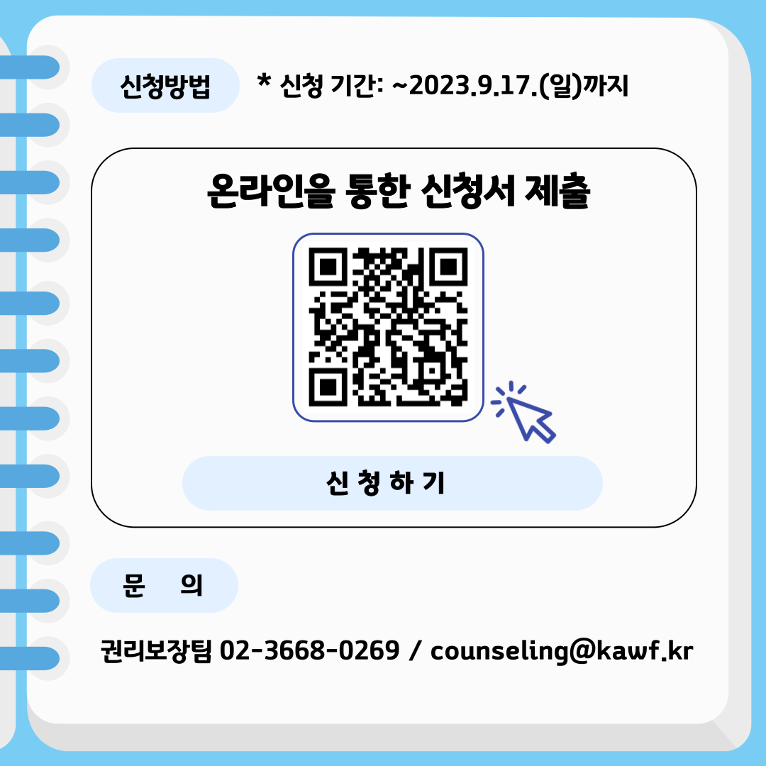 2. 강사: 주지영(서울시 자살예방센터 부센터장) 3. 진행 일시: 2023년 9월 19일(화), 14:00~16:30 (2시간 30분) 4. 진행 장소: 실시간 온라인교육(ZOOM) 5. 참여 대상 - 동료의 생명을 지키고 싶은 예술인이라면 누구나 - 예술인과의 접촉 빈도가 높은 예술관련 단체, 기관 종사자 7. 신청 안내 - 신청기간: ~2023.9.17.(일)까지 - 신청방법: 신청링크 클릭 → 신청서 및 사전질문지 작성 → 제출 - 신청링크: https://naver.me/xMEMqnpl 8. 문의처: (전화) 02-3668-0269, (메일) counseling@kawf.kr ※ 프로그램 신청 ·종료 시점에 본 프로그램에 대한 평가와 참여의견을 수렴하기 위한 설문이 진행되오니 신청자 여러분의 적극적인 참여를 바랍니다. ※ 프로그램 수료증은 발급되지 않습니다. |