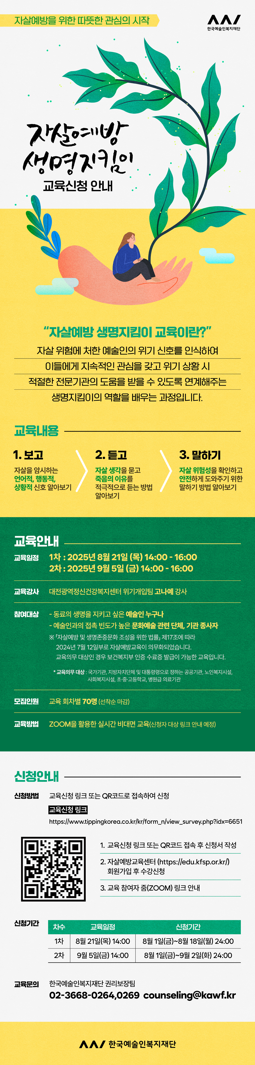 ○ 교육명: 자살예방 생명지킴이 교육 <보고, 듣고, 말하기> 2.0 기본편 ○ 교육일정 (신청기간) 1) 1회차: 2025. 8. 21.(목) 14:00 ~ 16:00 (2시간) *1회차 교육은 마감되었습니다. 2) 2회차: 2025. 9. 5.(금) 14:00 ~ 16:00 (2시간) ○ 교육대상 1) 동료의 생명을 지키고 싶은 예술인 누구나 2) 예술인과의 접촉빈도가 높은 문화예술 관련단체 및 기관 종사자 ○ 신청기간 1) 1회차: 8. 1.(금) ~ 8.18.(월) 24:00까지 *1회차 교육은 마감되었습니다. 2) 2회차: 8. 1.(금) ~ 9.2.(화) 24:00까지 ○ 모집인원: 교육 회차 당 70명 (선착순 마감 예정) ○ 교육방법: 줌(ZOOM)을 활용한 실시간 비대면 교육 진행 *청각장애인 정보접근성 향상을 위한 문자통역 서비스 제공 예정 ○ 교육강사: 대전광역정신건강복지센터 위기개입팀 고나예 강사 ○ 교육내용 1) 보고: 자살을 암시하는 언어적, 행동적, 상황적 신호 알아보기 2) 듣고: 자살생각을 묻고 죽음의 이유를 적극적으로 듣는 방법 알아보기 3) 말하기: 자살위험성을 확인하고 안전하게 도와주기 위한 말하기 방법 알아보기 ○ 신청방법 및 수강 절차 1) 교육신청 QR코드 또는 설문링크를 통한 신청서 작성 *신청링크(바로가기) 2) 신청자 대상 교육 수강링크 전달(문자별도 안내 예정) -> 자살예방교육센터 수강페이지 접속 -> 회원가입후 수강신청 3) 교육자 대상 줌(ZOOM) 링크 안내 및 교육 실시 * 교육자 대상 교육 전일 및 당일 교육 안내 및 줌(ZOOM)링크 사전 전달 예정 4) 교육완료 후 만족도조사 실시 및 수료증 발급 ○ 문의처 (한국예술인복지재단 권리보장팀) 1) 유선: 02-3668-0264/0269 2) 이메일: counseling@kawf.kr ※ 수료증 발급을 원할 경우 반드시 자살예방교육센터 수강신청까지 완료해 주셔야 수료증 발급이 가능합니다. (수료증 발급 확인) 자살예방교육센터 홈페이지(https://edu.kfsp.or.kr/) -> [나의 교육] -> [수료증 발급] -> [수강완료] 탭의 [발급] 버튼 클릭 |